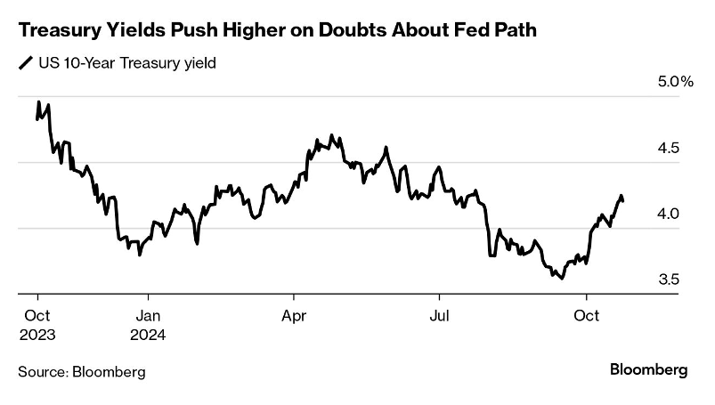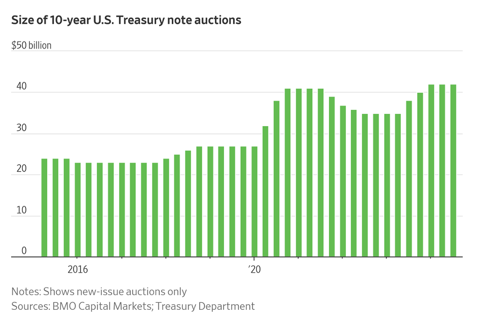 “The prospect of a rising federal deficit is fueling a sharp climb in bond yields, with investors betting a challenging fiscal situation might only get worse after the election. Treasury yields, which rise when bond prices fall, jumped Monday after a $69 billion government auction of 2-year notes attracted tepid demand from investors.”