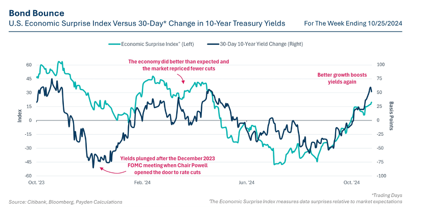 The fixed income and economics team over at Payden & Rygel pointed out in their investment note on October 25 th that the market overestimated how much the economy was slowing back during the summer. Remember in early August that some were breathlessly crying for emergency inter-meeting cuts to stave off financial disaster. Well, the US Economic Surprise Index pulled a “Gomer Pyle”, showing that there is more resiliency in the economy than perhaps many thought. And with it may come a different outlook for risk assets.