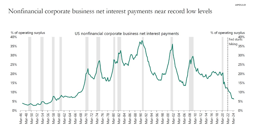 Apollo’s Chief Economist points out that the Fed rate increases that started several years ago did not have the same “transmission effect” through the economy that was historically expected. The same will be true now in the opposite direction as the Fed rates come down, because in aggregate, corporations moved dramatically to refinance at near zero rates over the last 5 years and thus have dramatically lowered the overall debt service they face.