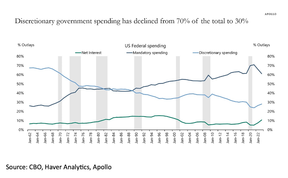 And the issue of deficits and their impact on markets and the economy are not going to get easier to solve going forward. For decades now Congress has shifted more and more spending to mandatory social programs, leaving less and less that is actually discretionary. The impact of this will be significant and very hard to navigate politically for years to come.