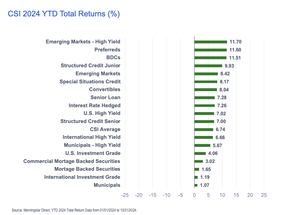 For the year to date, the CSI was still solid green with all 18 sub-categories in positive territory. This is quite impressive and reflects the power of expectations perhaps more than fundamentals for credits. Expectations have been that inflation was subsiding, and the economy was slowing, perhaps even achieving a soft landing and that rates were going to fall. Certainly, the Fed’s 50 basis point move down reaffirmed the idea that rates overall could go lower. But something interesting happened on the way to a raging bull market in bonds…