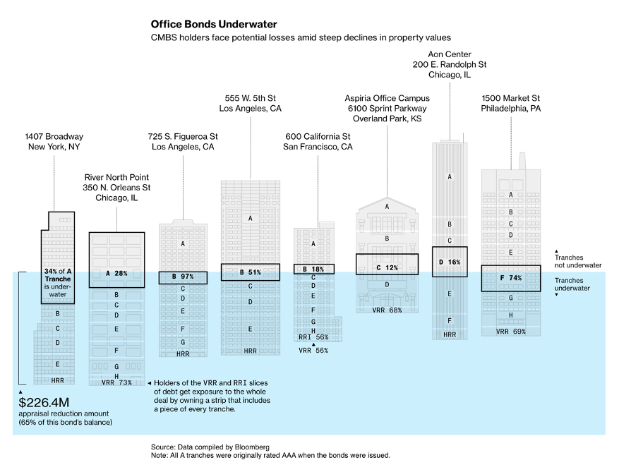 The summary is that there is much to be distressed about in some of the most glamorous office properities across the nation. And the impact is not just being felt in Mezz and lower rated structured credits of real estate securities. It is pushing higher for a few specific issues, all the way to the top, breaching the AAA traches, something unheard of since the GFC.