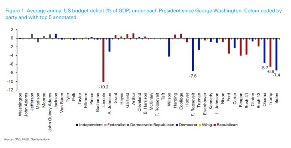 But while corporations may have used the zero-rate environment to get their financial houses in order, our beloved Federal government did not do the same. In fact, this great piece out from Deutsche Bank, using FRED data from the St Louis Fed, shows the average annual budget deficit under every President in US history.
