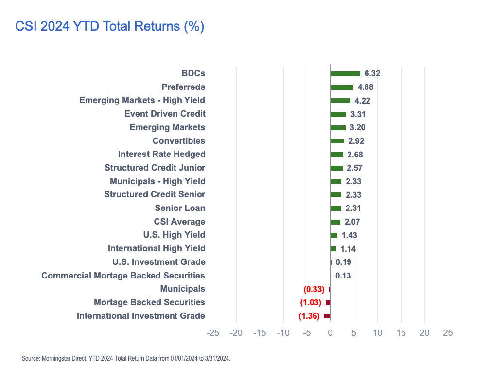 The Destra Credit Strategies Indicator (“CSI”) was nearly solid green in the month of March, with 17 of 18 categories in positive territory. The BDC category took the lead yet again, up an astonishing 4.03% for the month of March alone. It was joined in the top ranks by Emerging Market Debt, up 2.20% and Convertibles, up 2.18% respectively for the month.