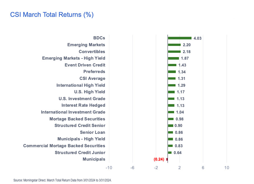 On the other end of the scale, Municipals were the only CSI category in the red for March, losing (-0.24%). The Structured Credit Junior category managed a positive 0.64% but was the second worst performer in the CSI for the month, with CMBS strategies rounding out the bottom three, up 0.83%.