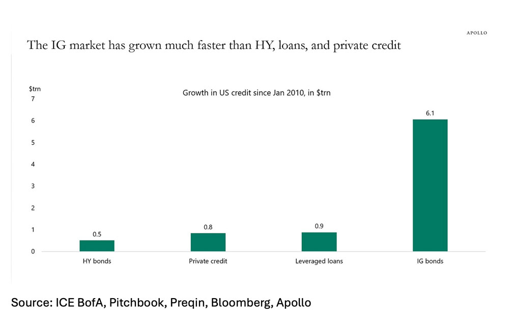 In a very interesting technical note, Torsten Slok of Apollo points out that while there is a lot of investor interest in high yield, leveraged loans and private credit, the investment grade corporate market has exploded in the last 14 years and now dwarfs the size of the lower rated parts of the credit marketplace.