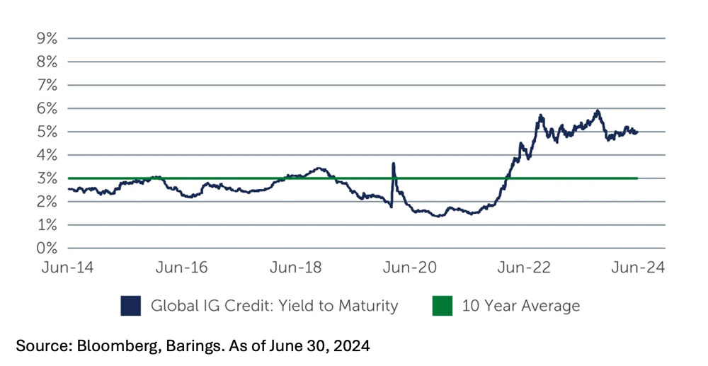 And it is not just the very short end of the market that offers a 5 -handle now. In a recent market note, Barings commented on investment grade corporates, stating, “…yields across the asset class haven risen to 5.43%, a level….nearly double the 10-year average.”
