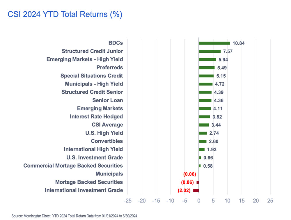 Emerging Market High Yield strategies, Preferreds, and Special Situations Credits all have returns above 5% YTD delivering 5.94%, 5.49%, and 5.15% respectively through the end of June.