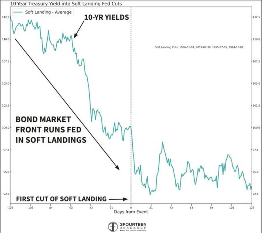 Warren Pies of 3Fourteen Research had an interesting chart on X (formerly Twitter) this week. “Remember: In soft landings, the majority of the move in yields comes in anticipation of the first Fed cut.”