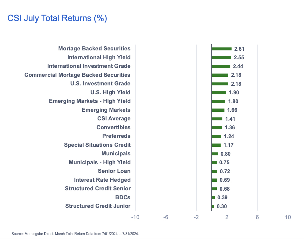 For July, Destra’s Credit Strategies Indicator (“CSI”) was all green! All 18 categories in the CSI were positive on a total return basis in July.