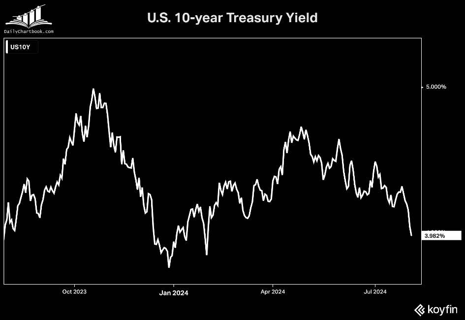 And the market is certainly “anticipating” a cut from the Fed. The DailyChartBook.com showed that … “The yield on the US 10-year Treasury fell below 4% today (July 31st) for the first time since February.”