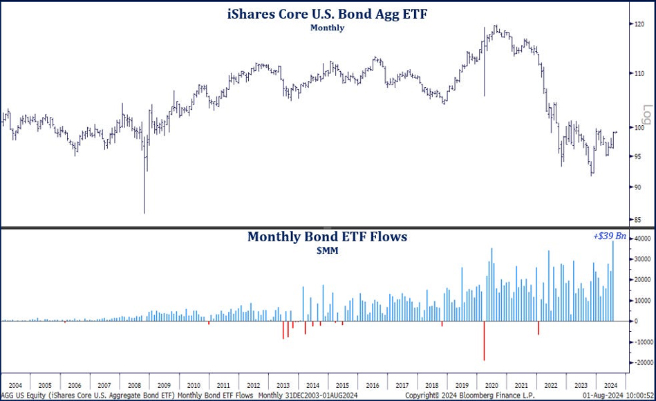 All those great returns had investors chasing bonds. According to the team at Strategas, “Bond funds saw inflows of roughly $39 billion in July, the most on record.”