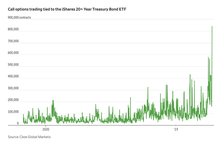 The Wall Street Journal noted “Call options trading tied to the iShares 20+Year Treasury Bond Exchange-Traded Fund jumped to a record…. according to Cboe Global Markets. That's a sign people are piling into contracts that would profit if the fund kept rallying…. The fund, known by the ticker symbol TLT, has become one of the hottest investments on Wall Street, with hordes of investors rushing to buy the dip in the ETF.”