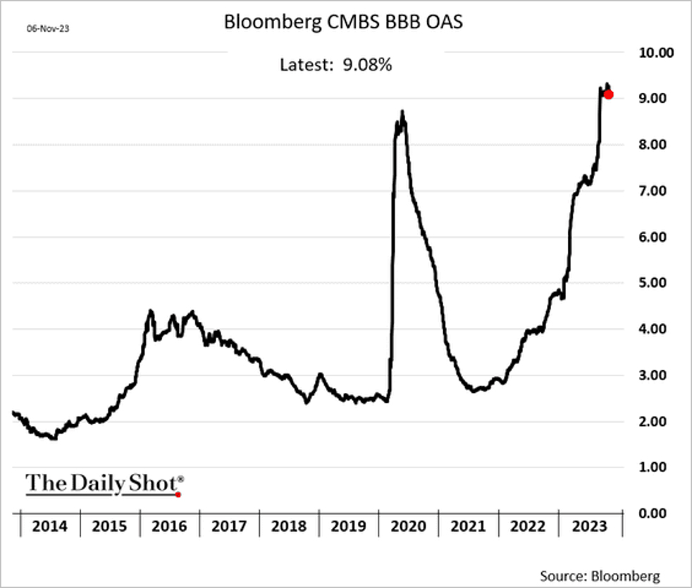 …not in the Commercial Mortgage Backed Securities markets. “Spreads are holding at multi-year highs, signaling concerns about commercial property credit,” according to Bloomberg. Despite the concerns, the CMBS category did well in November, up 3.49%. Its cousin, the “residential focused” MBS category did even better, up 5.27%, as US housing prices showed remarkable price resilience, despite a dramatic drop in the number of homes actually sold coast to coast.