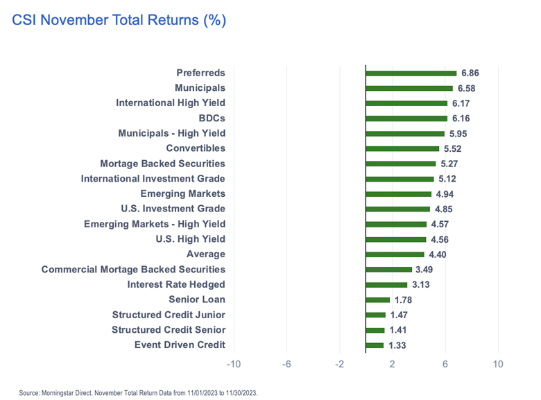 It seemed everywhere you turned in November, it was green on the screen! Preferreds led the way up some 6.86% in the month, followed by Municipals and International High Yield. Talk about a heterogenous mix at the top of the performance charts!